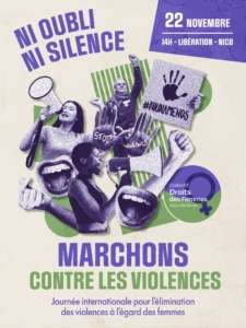 Pour la journée internationale de lutte contre les violences faites aux femmes du 25 novembre, nous manifesterons en solidarité avec et pour les femmes du monde entier : celles qui sont victimes des violences machistes, de conflits armés, de viols de guerre, de famine, de spoliations de terres et de leurs biens naturels, de gouvernements réactionnaires et d’États théocratiques, avec toutes celles qui ne peuvent pas parler, dont les voix sont étouffées, qui subissent des violences sexuelles, des tortures et des mutilations.